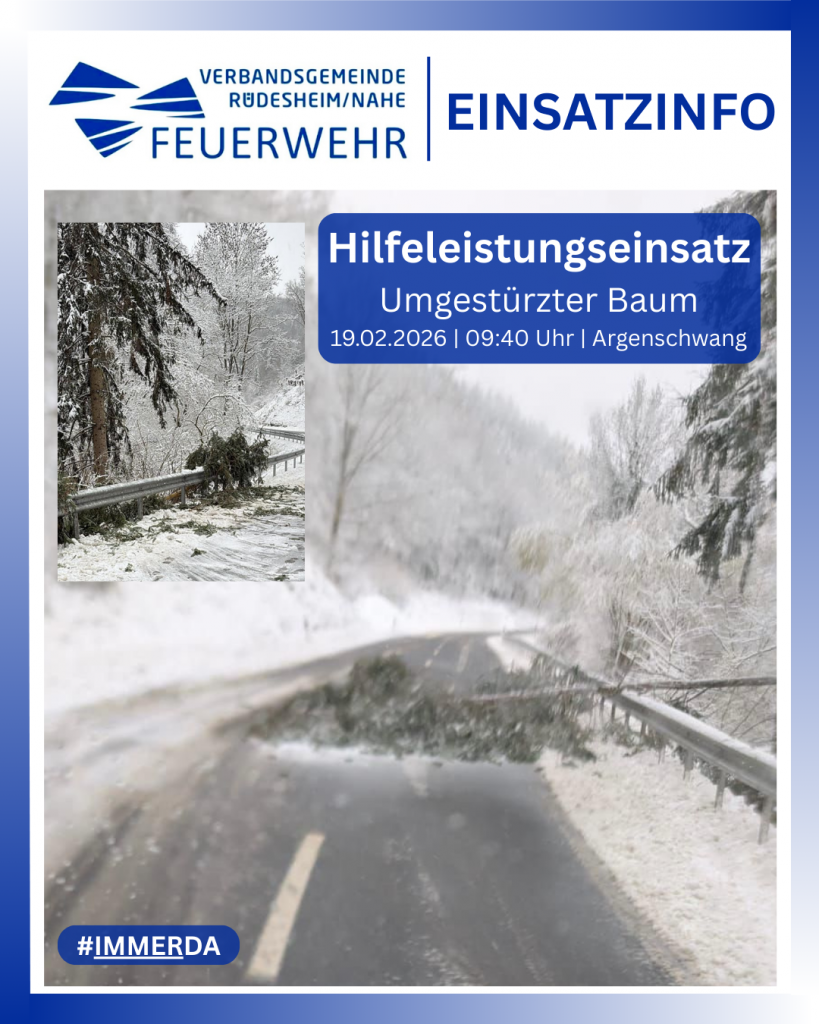 Während die Straßenmeisterei bereits am frühen Morgen zwei Bäume von der Fahrbahn räumte, wurden um 9:40 Uhr die Ausrückegemeinschaften Argenschwang-Dalberg und Spabrücken-Hergenfeld sowie die FEZ Rüdesheim zu einem weiteren umgestürzten Baum alarmiert. Die Feuerwehren räumten den Baum zur Seite und reinigten die Fahrbahn grob. (rg)
