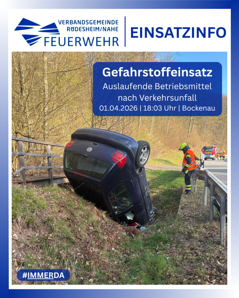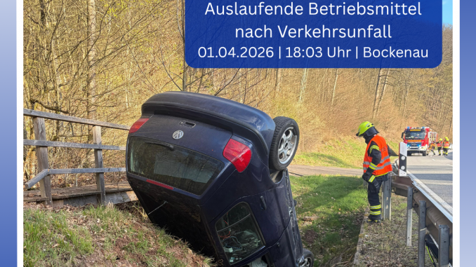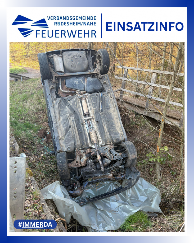 Die Einsatzkräfte der Feuerwehr Bockenau unter Leitung von Wehrführer Stefan Röder fand an der Einsatzstelle einen VW Polo älteren Baujahres vor, der in einem Graben neben der Fahrbahn auf dem Dach lag. Betriebsstoffe liefen keine aus, die Feuerwehr legte vorsorglich eine Plane unter den Motorbereich, um eines möglichen Betriebsmittelaustritt ins Erdreich zu verhindern. Weitere Maßnahmen waren die Sicherstellung des Brandschutzes und Absicherung der Einsatzstelle. (rg)