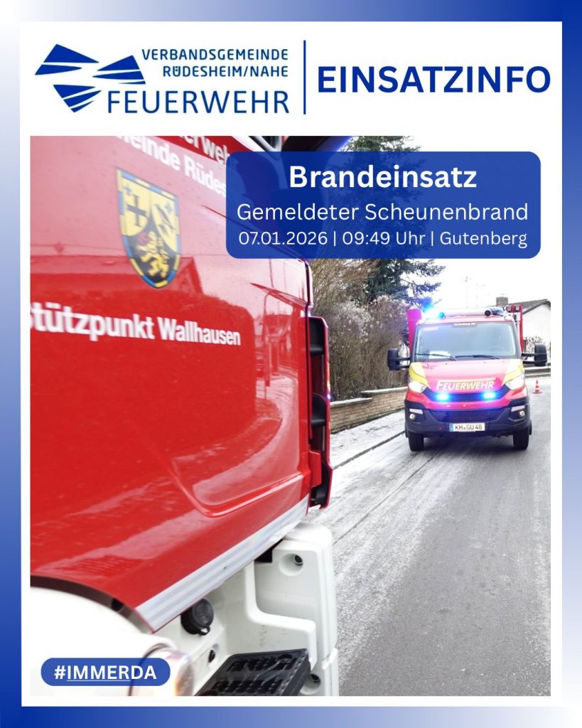 Um 9:49 Uhr ging der Alarm mit dem Stichwort „B3.01 – Brand landwirtschaftliches Gebäude“ bei den Feuerwehren aus Gutenberg, Hargesheim-Roxheim, Rüdesheim und Wallhausen sowie der Wehrleitung und der Führungsunterstützung ein. Außerdem wurde die Drehleiter des Löschbezirks Nord der Feuerwehr Bad Kreuznach alarmiert. Zuvor hatte ein Bürger über Notruf mitgeteilt, dass eine Scheune in der Gräfenbachstraße am westlichen Ortsrand in Flammen stünde.