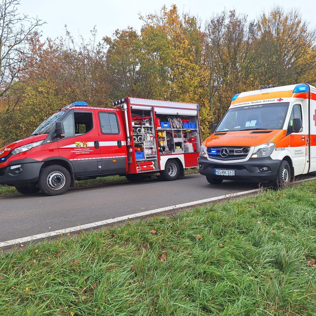 Via automatischem eCall des BMW wurde der erste Notruf an die Leitstelle übermittelt, weitere Notrufe von Autofahrern folgten. Da anfangs unklar war, ob Personen im Fahrzeug eingeklemmt sind, wurde auch die Feuerwehr alarmiert. An der Unfallstelle unweit des Marienhofs hatten die beiden Insassen das Fahrzeug bereits verlassen. Der Beifahrer klagte über Rückenschmerzen und wurde von Einsatzkräften aus Hüffelsheim bis zum Eintreffen des Rettungsdienstes betreut. Mit einem RTW des DRK kam der Patient zur weiteren Abklärung ins Krankenhaus.