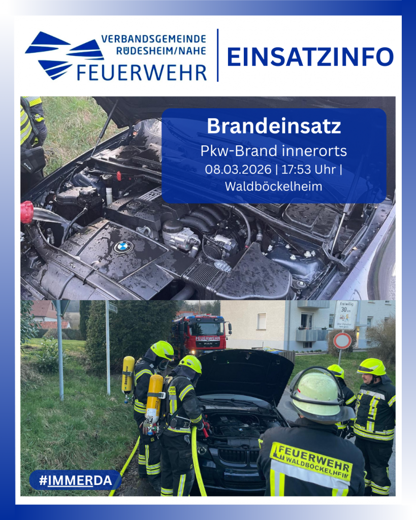 Ein brennender Pkw war Anlass für die Alarmierung der Feuerwehreinheit Waldböckelheim am frühen Sonntagabend. An der Einsatzstelle in der Berliner Straße stellte Einsatzleiter Christian Burkard eine starke Rauchentwicklung aus einem geparkten BMW 3er-Reihe fest, im Fahrzeug befanden sich keine Insassen. Zwei Passanten hatten das Fahrzeug vor Eintreffen der Feuerwehr noch einige Meter nach vorne geschoben, um einen Übergriff auf eine unmittelbar angrenzende Hecke zu verhindern.