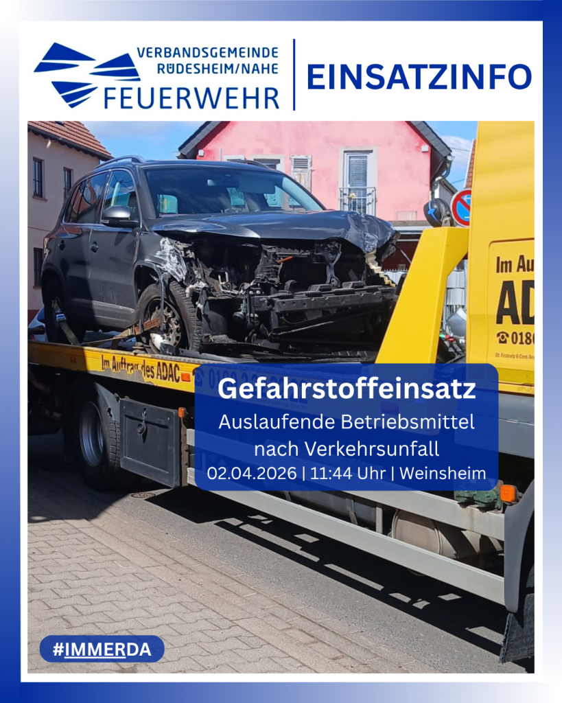 Gegen 11:40 Uhr prallte ein VW Tiguan aus für die Feuerwehr nicht bekannten Gründen in der Sponheimer Straße auf einen vorausfahrenden Nissan Qashqai. Durch den Aufprall drehte sich der Nissan, der VW kam an einer Hauswand zum Stehen. Alle Unfallbeteiligten konnten die Fahrzeuge eigenständig verlassen und wurden bis zum Eintreffen des Rettungsdienstes von couragierten Ersthelfern und den kurz darauf eintreffenden Kräften der ebenfalls alarmierten Feuerwehreinheit Weinsheim betreut.