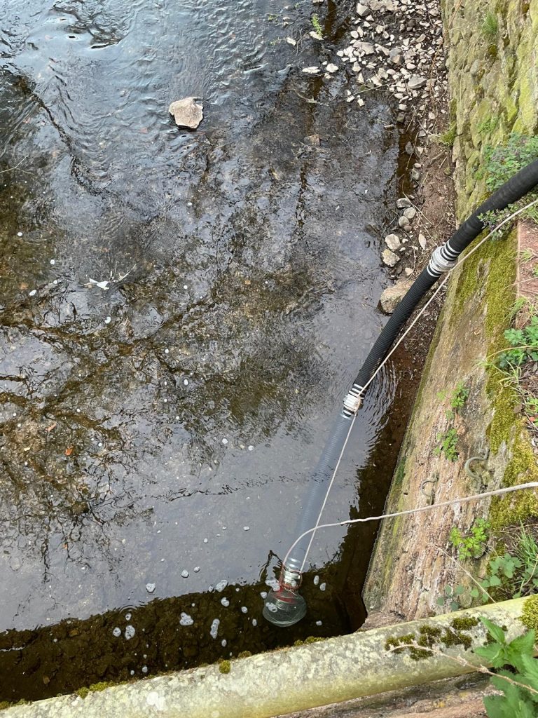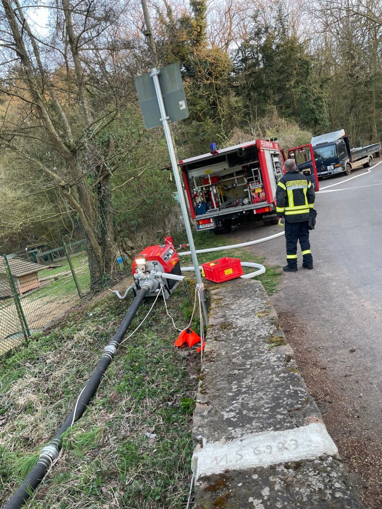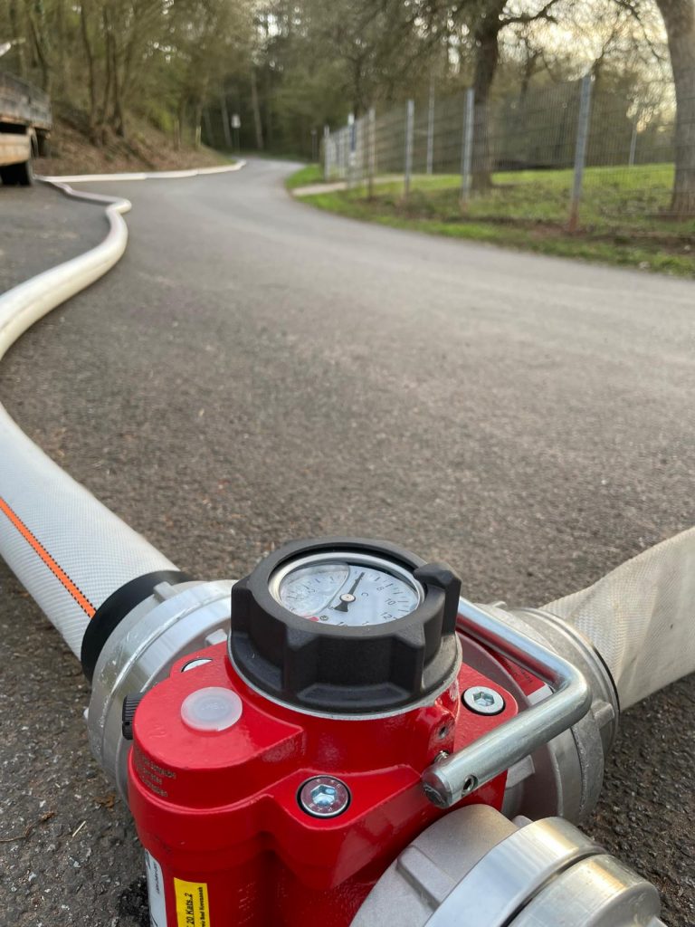 Um die Brandbekämpfung effizient zu gestalten, baute die Feuerwehr Hargesheim-Roxheim unter Führung von Gruppenführer Patrick Webler eine Wasserförderung über eine lange Wegstrecke vom Ellerbach auf den Kesselberg auf. Während die Wasserentnahme am Ellerbach durch das KTLF und eine PFPN erfolgte, verlegte die Besatzung des LF 20 KatS die B-Leitung von der Wasserentnahmestelle auf den Kesselberg. Von den 600 Metern B-Schlauch kamen 340 Meter zum Einsatz, eine Verstärkerpumpe wurde in der Hälfte der Steigungsstrecke eingebaut. Als Übergabepunkt an die Löschfahrzeuge kam der Faltbehälter des LF 20 KatS zum Einsatz, dort wurden die Löschwassertanks der Fahrzeuge gefüllt.