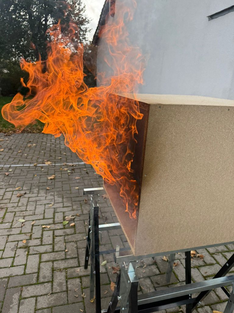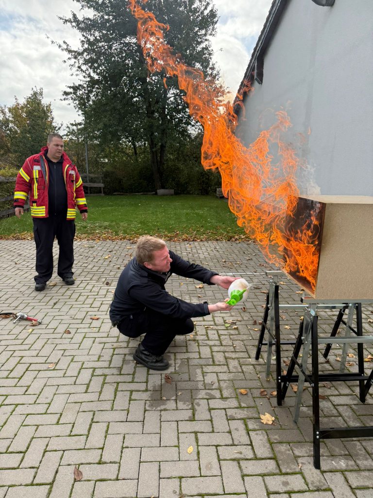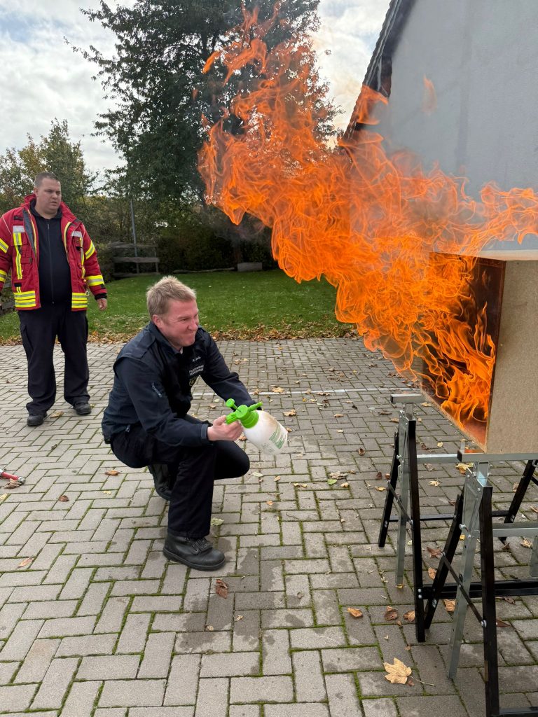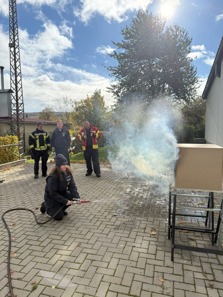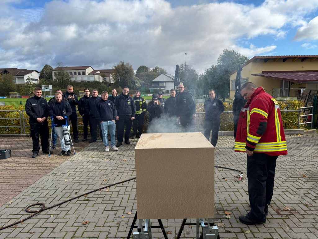 Ausbilder Harald Niephaus erläuterte die verschiedenen Phänomene des Brandrauchs und in welchen Situationen und bei welchen Temperaturen sich ein Rollover (Rauchgasdurchzündung), ein Flashover mit schlagartigem Übergang vom Entstehungsbrand zum Vollbrand oder ein Backdraft als Rauchgasexplosion entwickeln und die Einsatzkräfte diese Entwicklung erkennen können. Mit praktischen Übungen an einem Brandversuchsmodell lernten die Teilnehmerinnen und Teilnehmer, dass ein gezielter Außenangriff durch ein Fenster, der sogenannte Fensterimpuls, einen raschen Löscherfolg bringen kann.